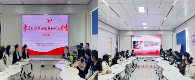 首先,邵奇老师带领全体成员学习了“两会”精神,集中观看“两会”的视频节选。学生结合“两会”重点议题,联系实际,深入体会“两会”精神及要点,就“我们眼中的两会”“高校毕业生就业新提案”等方面进行了交流。