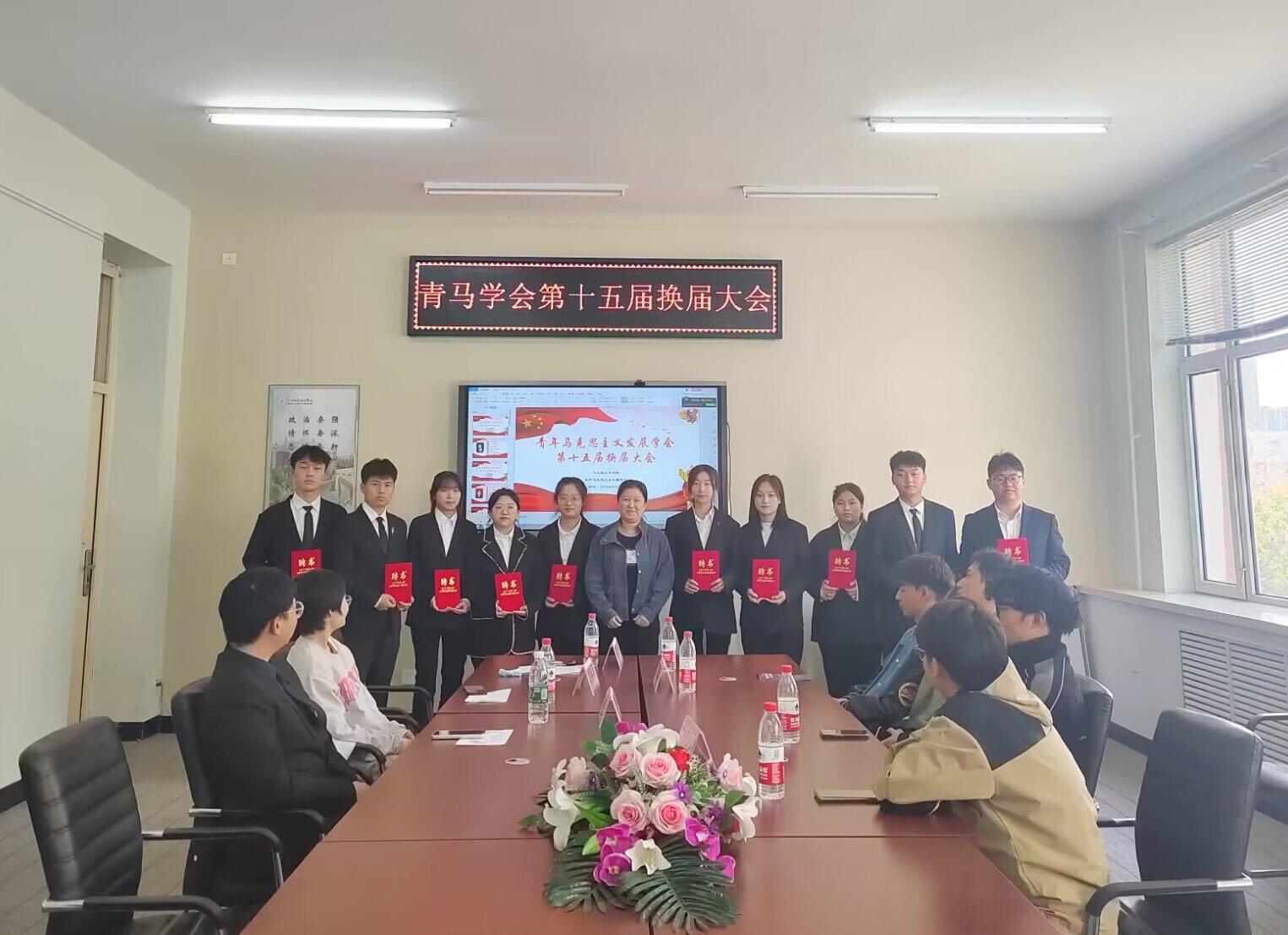 最后,指导教师邵奇老师对本次换届选举大会进行总结致辞,本次青马学会换届选举大会顺利召开,不仅为青马学会注入了新鲜血液,也进一步提高新一届学会干部的责任心与积极态度,希望各位干部,明确自身责任,以身作责,为青年马克思主义发展学会的发展增加一份新光彩。同时,邵奇老师为新一任干部颁布了聘书,合影留念,也代表本次换届选举大会在欢声笑语中圆满结束。
