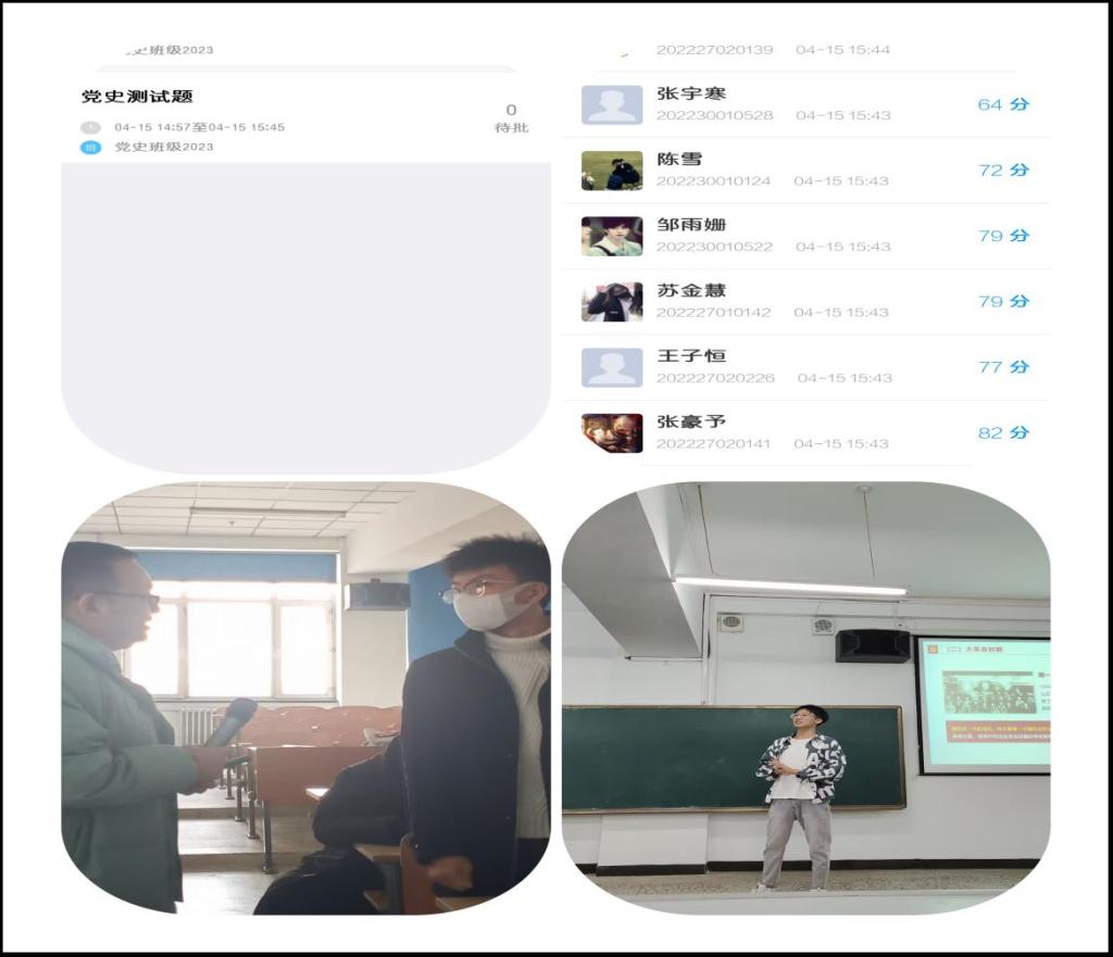 本门课2学分,32学时,这两学期先后共计200余人进行了选修,课堂内容丰富,人数多,学生积极主动学习效果更好。党史概览课程始终以学生为中心,多次开展了交流互动和PPT汇报互评比赛,让学生们真正了解党史,结合自身专业抒发自己的党史情怀。此外,教师还进行了随堂测试,把堂堂测,随时练扎根在平时,运用到平时。截至目前,党史概览课共计进行随堂测试4次,学生基础知识和动脑能力得到了全面提升。期末考试学生成绩栏中教师还加入了档次评分,让优秀的学生充分体现出来,从而增加他们的获得感和成就感。课堂上教师运用各种有意义的故事,耐人寻味的奋斗历程,将党的历史发展厘清讲透,教师还充分运用案例教学法,对比分析法把每一个活生生的例子展现在学生面前,让原本枯燥的知识理论瞬间变成一个营养丰富的美味知识“大餐”。