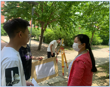 为发挥思想政治理论课立德树人的“主渠道”“主阵地”作用,认真落实“四真三化(FT)”课程建设模式下的思政课建设,更好的“服务专业”、“服务学生成长”。6月23日下午,思政教学部邵奇、张旭两位老师走进了2教2511土木专业21级学生校内实习地点,土木21级学生正在对一号教学楼、汽车大楼进行测量并手绘平面图;风景专业部分学生在三教1201进行北校区景观设计和龙沙公园实测;工管专业学生主要在3教、1教、2教、图书馆等楼前现场勘察校园建筑,使用水准仪进行测量并绘制草图。