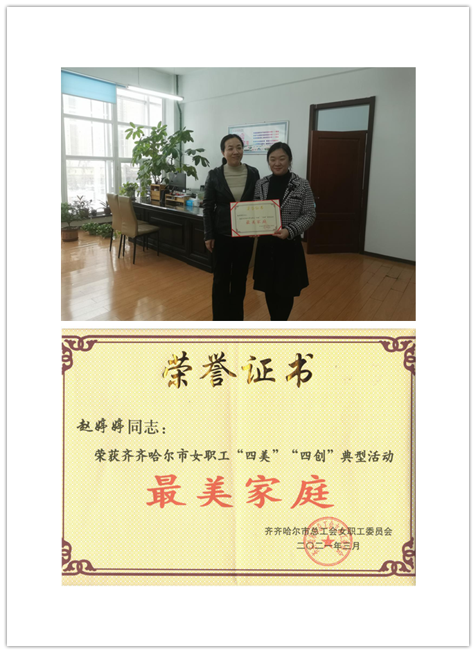 在齐齐哈尔市总工会女职工委员会组织全市女职工中开展的提升“四德”、争当“四好”、寻找“四美”主题教育活动中,我院工会积极响应活动号召,将优秀女职工代表推荐给市总工会,思政教学部基层工会赵婷婷荣获齐齐哈尔市女职工“四美”“四创”典型活动最美家庭称号,学院工会主席姜岩亲自为赵婷婷颁发证书。