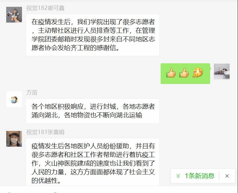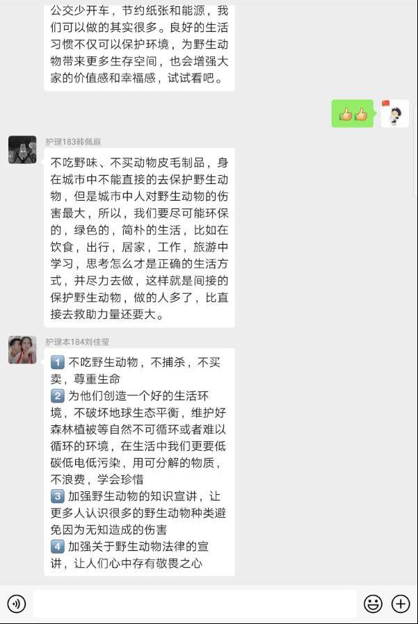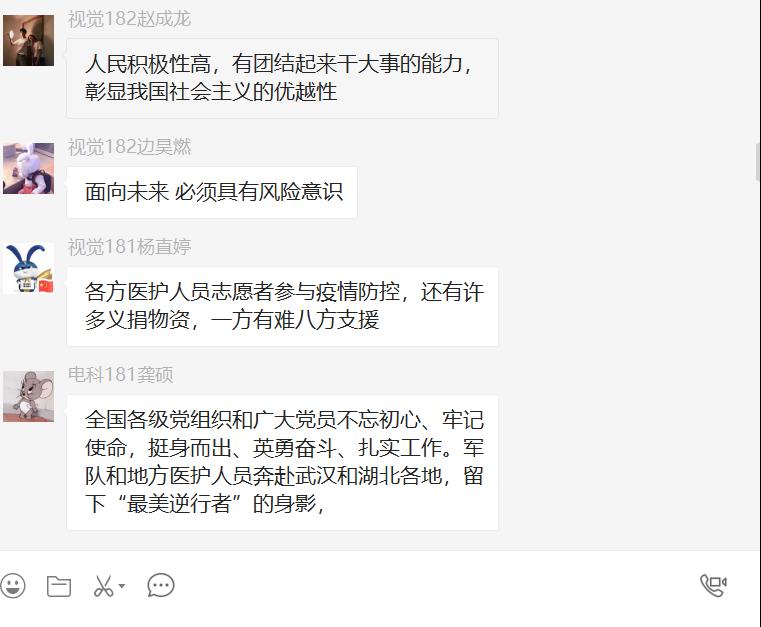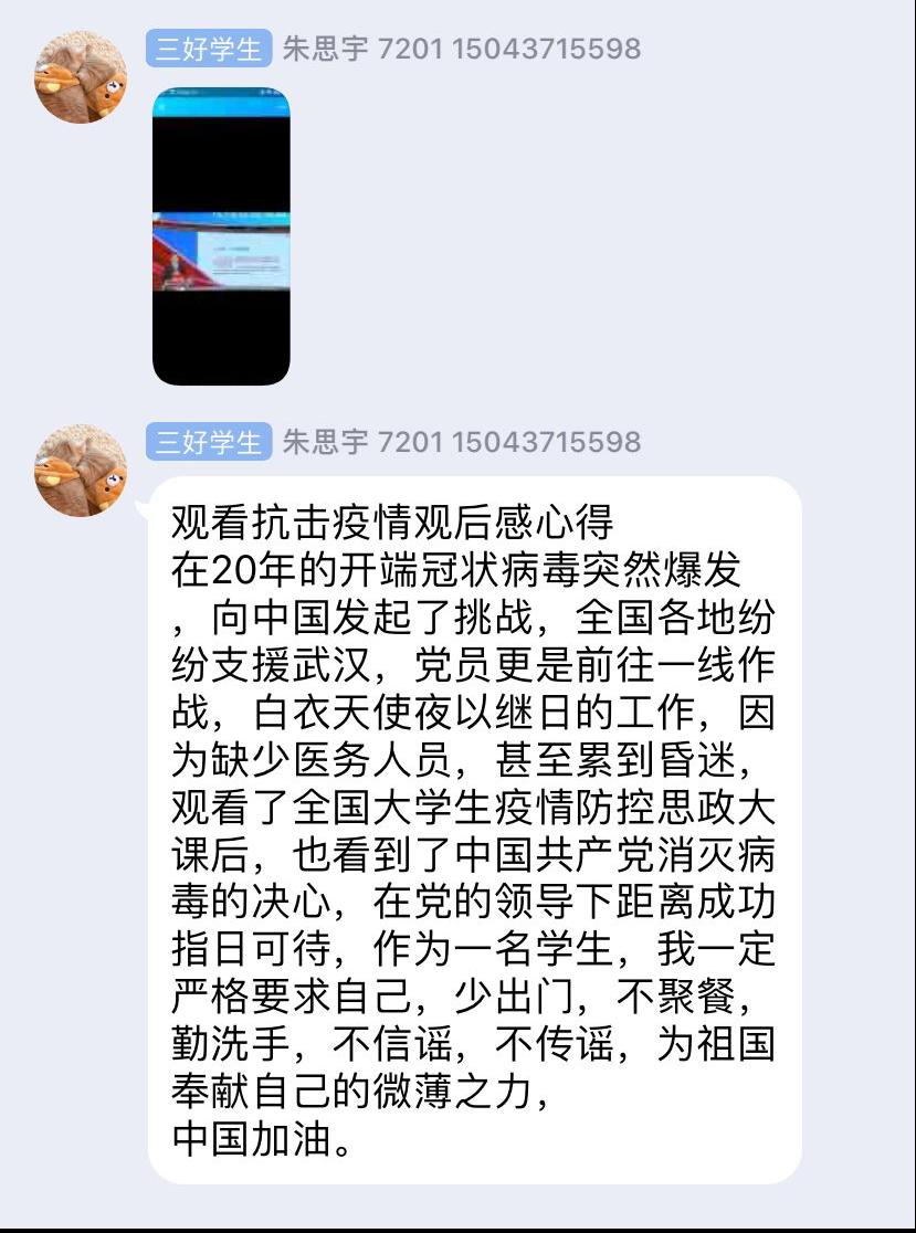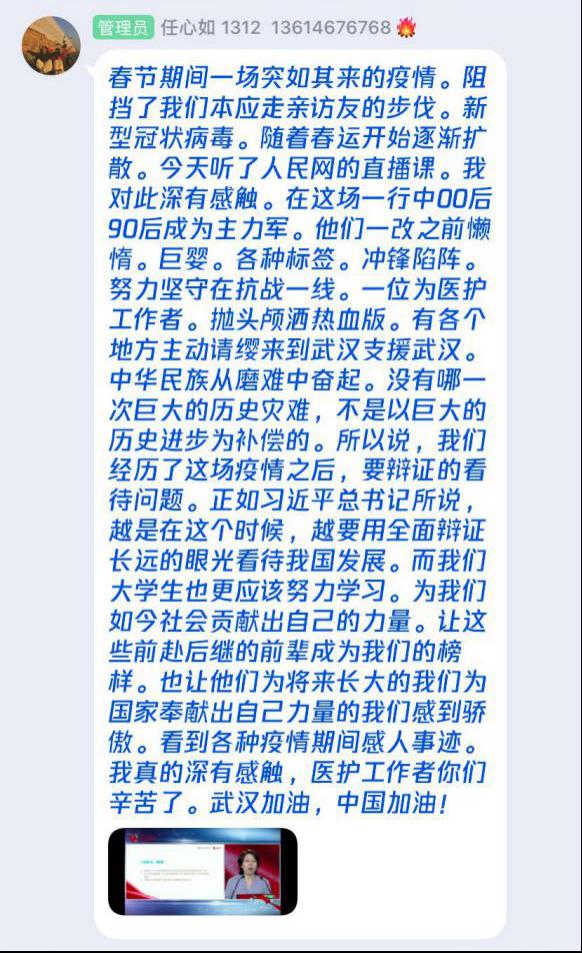 3、思政教学部教师与学生在线进行了讨论,一是围绕如何保护野生动物,尊重自然这一问题展开讨论。让学生要意识到大自然与人类是共同体,要积极保护自然,保护野生动物,参与公益宣传活动,在生活中减少资源的浪费,发挥自己的作用。二是讨论“中国制度”优势集结强大战斗力,在这次疫情中得到彰显。为打好疫情防控阻击战,习近平总书记亲自指挥、亲自部署,作出一系列重要指示,各级党委政府按照党中央决策部署全面动员、全面部署、全面加强防疫工作,团结带领广大人民群众,把落实工作抓实抓细。全国人民齐心协力,共克时艰,这场没有硝烟的战争中,清晰地见证了我们党以人民为中心的执政理念,见证了党的强大政治领导力、思想引领力、群众组织力和社会号召力。三是关于“中国速度”的讨论,中国火神山和雷神山医院建设项目之快,迅速调集军队医护人员和各省医护人员驰援武汉,为解决患者入院问题开启新模式,快速运送物资等,为抗疫赢得了防控工作主动权。此次抗击新冠肺炎战“疫”中,一次次被刷新的“中国速度”让国人看到了战胜疫情的希望,坚定了战胜疫情的信心,充满了对美好生活的期待。