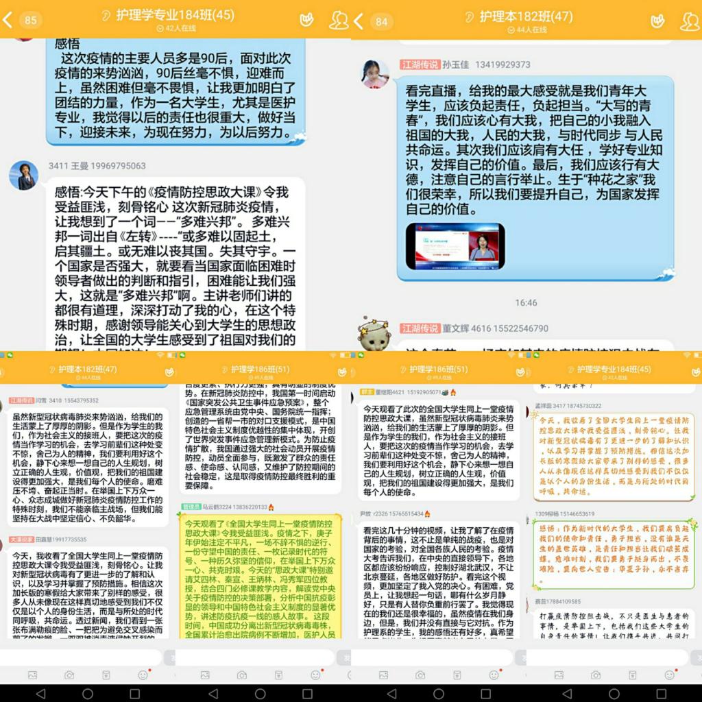 1、全校共有6225名学生,206名教师在人民智云、咪咕视频、学习强国等平台进行收看“同上一堂疫情防控思政大课”。收看结束后,组织师生展开讨论,引发思考,反响热烈,产生共鸣,抒发自己内心的感想。