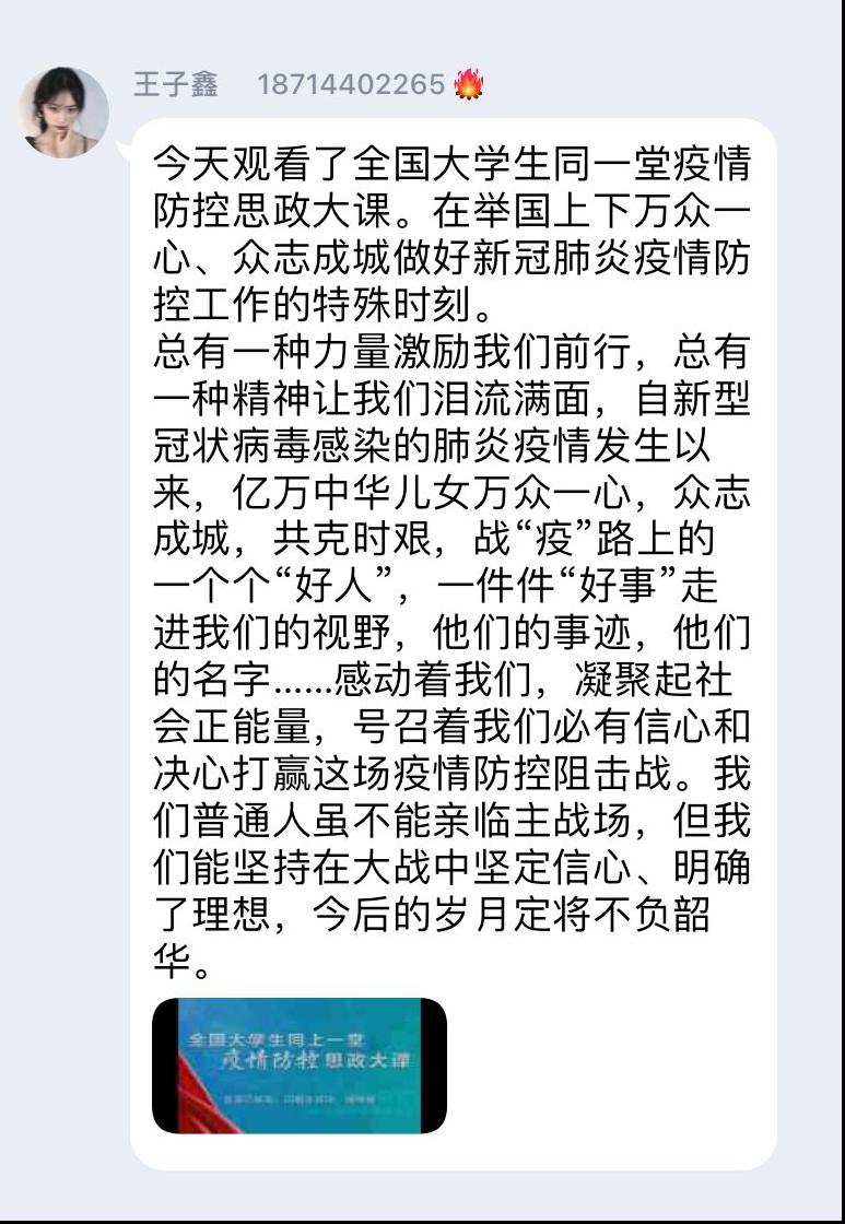 通过观看“全国大学生同上一堂疫情防控思政大课”,我更加深刻认识到,面对疫情,对于我们青年大学生来说,是不畏惧,是责任,是“天下兴亡,匹夫有责”的觉悟,青年之担当,更是刚毅。艾四林教授在直播课程中提到“改变食用野生动物的陋习,养成健康文明的饮食习惯,从我做起,从现在做起”。作为大学生,我们应懂得保护野生动物,提倡身边人保护野生动物,更要学会监督建议,为社会健全相关法律法规而献言献策。这是关系民族,关系整个世界生物多样性与安全的伟大事业。虽然我们不曾见过枪林弹雨、血染山河,但我们有责任有使命,不要在该奋斗的年龄选择安逸。相信更多精彩的中国故事,必将由我们来书写!
