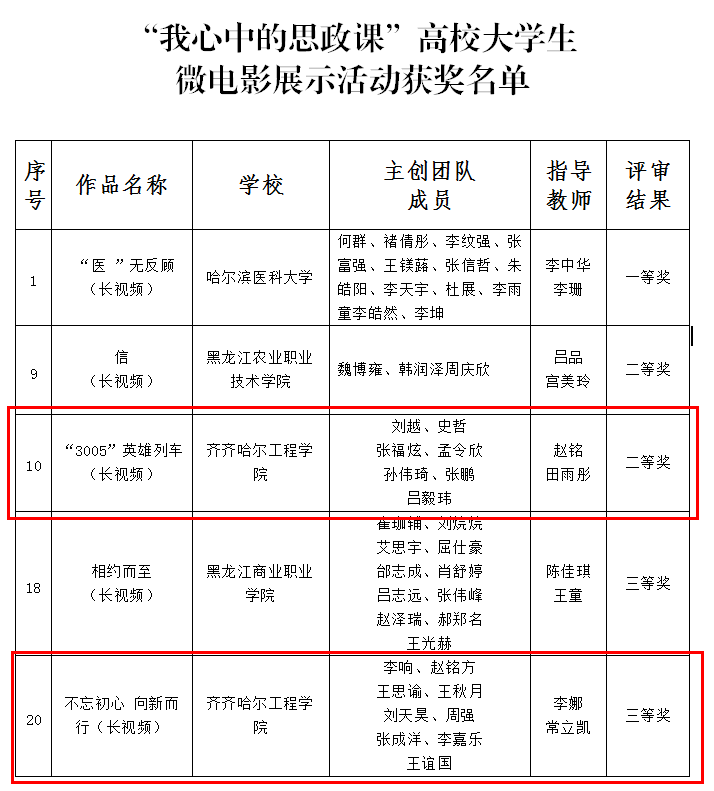 近日,黑龙江省教育厅公布了全省高校大学生“新思想·我来说”主题展示活动获奖作品名单。我院微电影作品《“3005英雄列车”》荣获二等奖,微电影作品《不忘初心 向新而行》荣获三等奖。