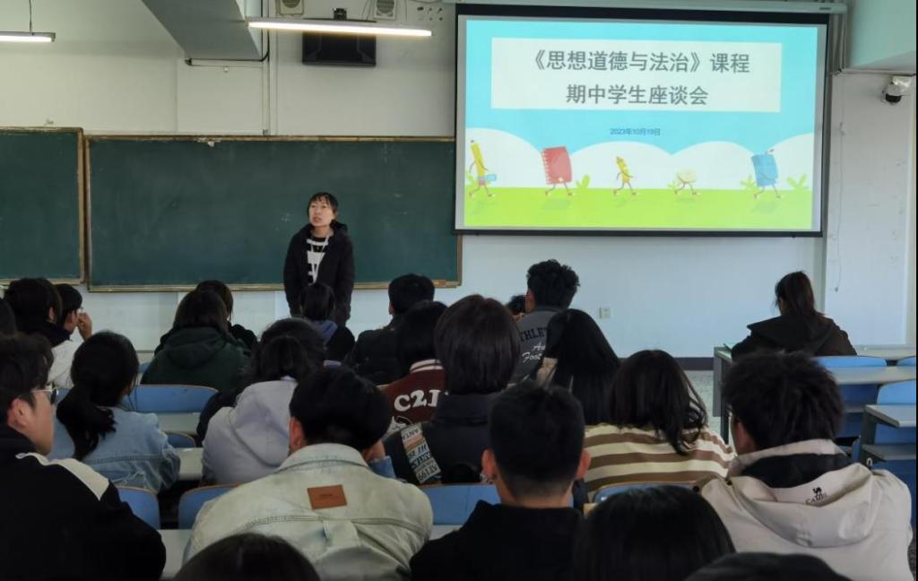 更好地落实“以学生为中心”的育人理念提高《思想道德与法治》课程教学质量和管理质量,提升学生对思政课的获得感,10月19日中午,基础教研室在图书馆201教室组织召开《思想道德与法治》课程期中学生座谈会。会议李心老师主持,教研室全体教师和2023级各班学生代表参加座谈会。