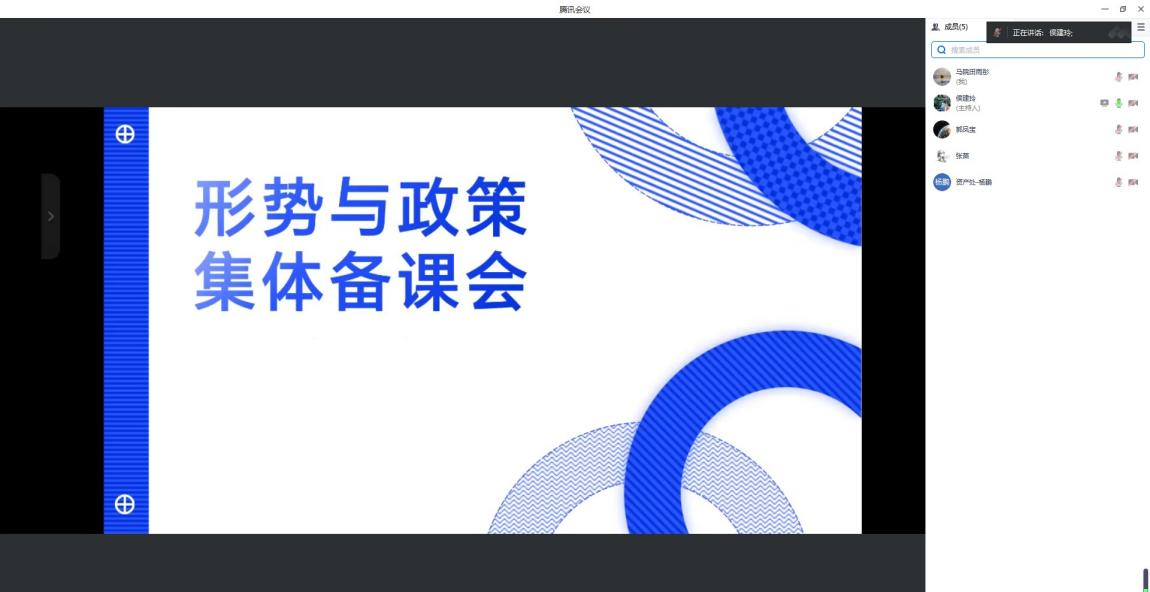 1016午,形策教研室召开集体备课会,会议由课程长侯建玲主持,行政兼课教师张苗、郭凤宝、杨鹏以及教研室教师田雨彤参加线上会议