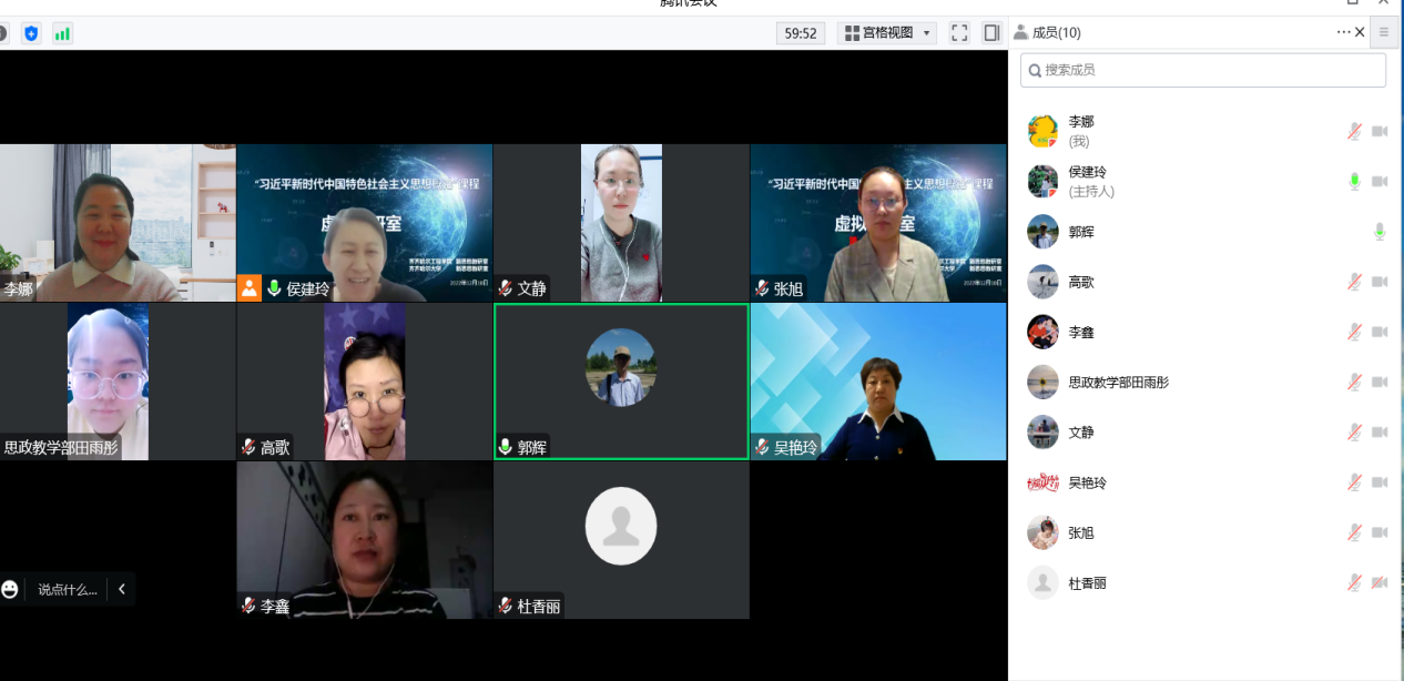 12月10日,我校思政教学部新思想教研室联合齐大新思想教研室建立“习近平新时代中国特色社会主义思想概论”课程虚拟教研室,并召开线上第一次研讨会。我校该部副主任李娜、齐大新思想教研室主任高歌及双方教研室的教师参会,我校课程长侯建玲主持。