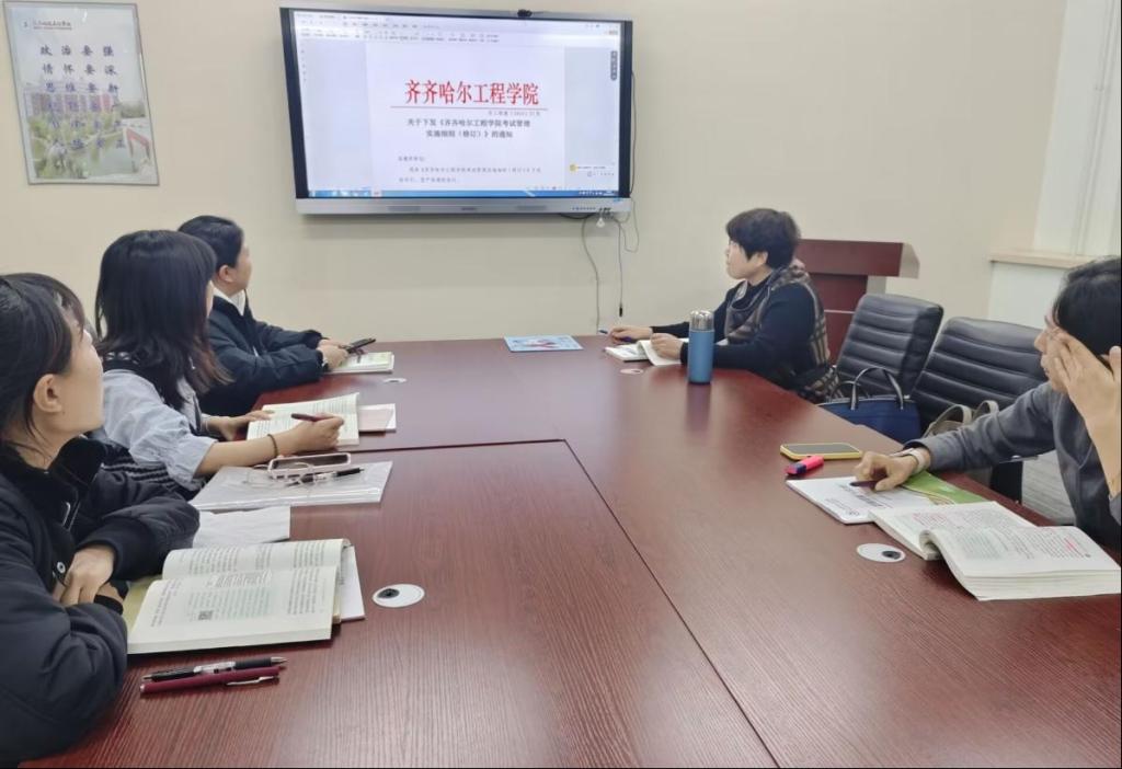 首先,邵奇老师组织集中学习了《齐齐哈尔工程学院考试管理实施细则(修订)》的文件,主要聚焦以下几个方面:一是重点关注免修免试学生的平时成绩给定、降级学生的平时成绩、对课堂中缺勤学生课时数多的学生进行预警。二是期末试卷命题相关要求。三是强调课程达成度的相关问题。