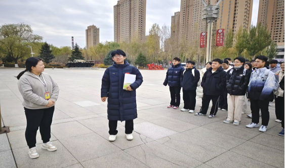 在明德广场前,学生们结合课前调研内容,分享着图书馆楼体“红、灰、白”颜色所蕴含的文化内涵,教师引导学生们要增强将知识内化于心、外化于行的能力。