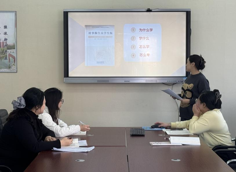 形势与政策教研室教师围绕如何将党的二十届三中全会精神融入教学专题进行深入讨论。提出要充分运用新时代伟大变革成功案例,深入挖掘案例所蕴含的思想资源、理论资源和育人资源,通过案例让学生深刻感受到习近平新时代中国特色社会主义思想蕴含的实践力量,引导大学生正确认识时代责任和历史使命。