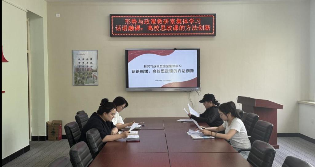 本次集体学习活动通过学习文章《话语融课:高校思政课的方法创新》,探索将话语融课理念融入思政课教学的有效路径,切实增强思政课的思想性、理论性和亲和力、针对性。首先,教研室主任田雨彤介绍了本次学习的背景和意义,强调了话语融课对于提升思政课教学效果的重要性。随后,教研室全体任课教师共同研读了文章《话语融课:高校思政课的方法创新》,参会教师围绕话语融课的内涵、价值、方法等方面展开了深入讨论。大家一致认为,话语融课是一种将思政课教学内容与时代话语、生活话语、学生话语有机融合的教学方法,能够有效打破理论与实践的隔阂,让思政课更加贴近学生、贴近生活、贴近实际。