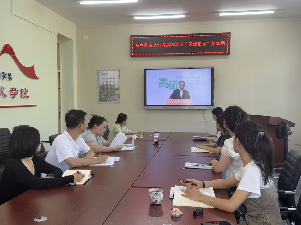 为深入学习贯彻习近平新时代中国特色社会主义思想,进一步推动思想政治理论课的创新与发展,7月6日当天,马克思主义学院组织全体教师齐聚线下,共同观看了思想政治理论课青椒论坛第39期——“习近平总书记关于新质生产力重要论述深度融入思政课”的直播。