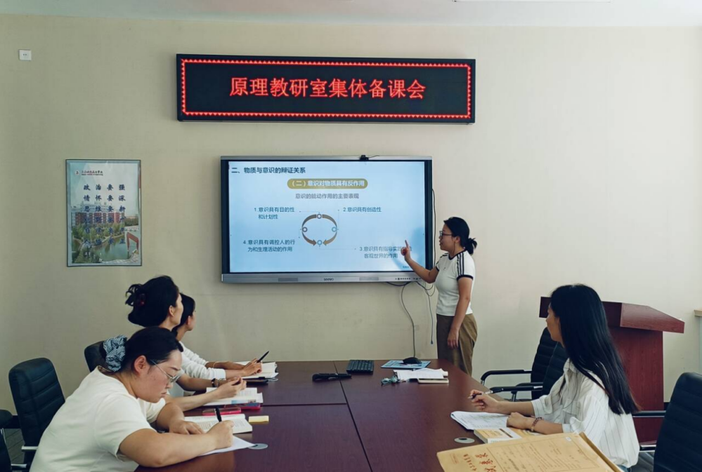 为扎实推进新学期教学工作,提升马克思主义基本原理课程教学质量,提升课堂育人实效和门课教师教学基本功,9月4日原理教研室在三号教学区1211会议室召开开学第一周集体备课会。教研室全体教师参会,会议由教研室主任赵立莹主持,围绕“第一周课堂教学总结”与“下一周新课集体备课” 两大核心议题展开深入研讨。