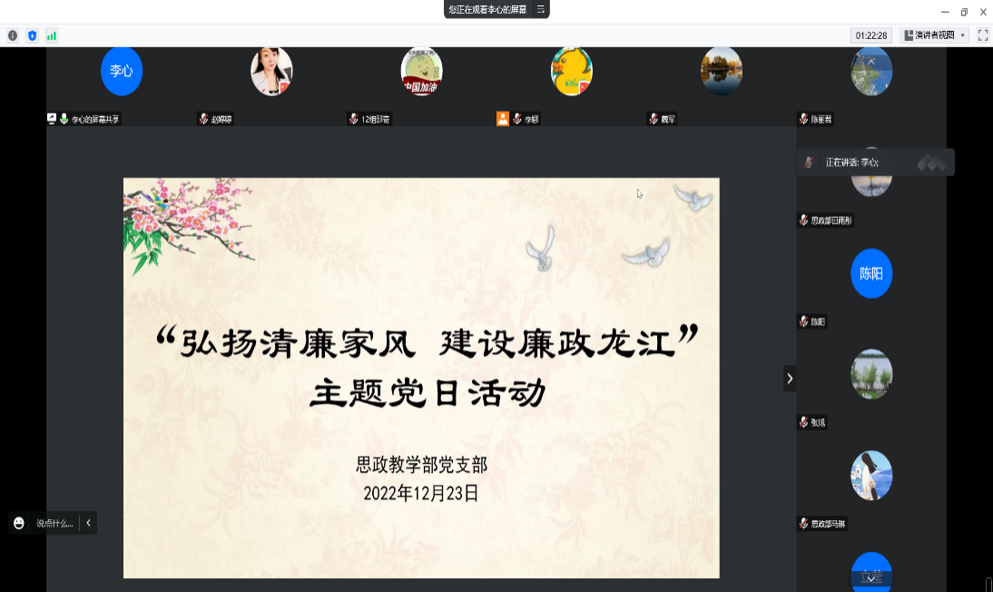 为加强新时代廉洁文化建设,教育引导广大党员增强不想腐、不能腐的自觉,清清白白做人、干干净净做事,让党员干部拧紧纪律之弦,系好廉洁之扣, 2022年12月23日,思政教学部党支部特开展 “弘扬清廉家风 建设廉政龙江”主题党日教育活动,能更好地营造以好家风促进好作风的浓厚氛围。