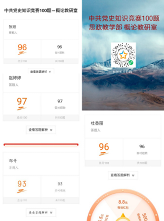 本学期开学以来,思政教学部多措并举,通过各种形式广泛开展党史学习教育,营造浓厚学习氛围。本次党史知识竞赛采用“问卷星”线上答题形式,激发了教师学习党史知识的热情,检验了教师党史基本知识、思想理论的学习效果。
